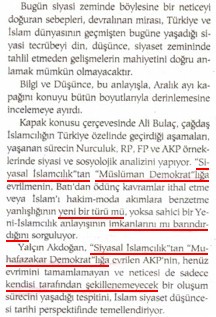 1. "Siyasal İslamcılık" böyle dırnak içine alınacak bir ıstılah ise şâyed ona mümâsil, muvâzin, mutaabık ve mukaabil olacak öteki ıstılah dahi olsa olsa "Müslüman demokratlık" olabilir, "Müslüman demokrat"ın mukaabili "Siyasal İslamcı" olabileceği gibi. Ya'nî ki, isim ise isim olsun, sıfat ise sıfat! Birini isim yapıp öbürünü sıfat hâlinde bırakmak, hem bilgi dikkatine, hem düşünce disiplinine halel getirmek olur. Ve bu, maalesef olmuşdur.