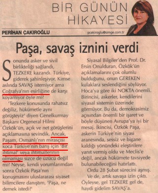 Çakıroğlu Parihan'ın yazısında "demokrasi"den, "hukûmet"den, "meclis irâdesi"nden filân bahsolunuyor olunmasına ammâ yazısına seçdiği serlevha pek ma'nîdar değil mi? "Paşa, savaş iznini verdi". Paşa, genelkurmay başkanı orgeneral Hilmi Özkök. Memleketde "paşa" lâfzının inkılâp kanunlarından birinin emriyle "yasak" kılınmış olması ve ol kanunun hâlen "mer'î" ya'nî ki "yürürlükde" olması hiç mühim değil. Esâsen, kanunlar çiğnenmek üzere vaz'olunuyor bu memleketde. Parihan kızımızın bu kanun çiğneyiciliğini yadırgamamak lâzım. Lâkin, "Coğrafya'nın esirliği" biraz tuhaf olmuş. Gaalibâ, "coğrafyaya esirlik" demek isteyor amma deyemeyor işte.
