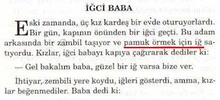 Peki "iğ" ne imiş, "iğci" ne imiş? deyû süâl etdiğimde, bir çeşit mil, onunla örgü örülür, dedi. İğci de onu satan kişi, dedi. Pek kızdım. Evlâdım, sen okuduğunu anlamaz mısın? deyü köpürdüm. Bak baba bak, öyle yazıyor, dedi. Baktım hakîkaten öyle yazıyor. "zembil"i "zambil" şeklinde yanlış yazmaları dikkatsizliğe hamledilebilir amma bu "pamuk örmek için iğ" ibâresi neyin nesidir?