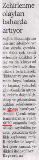 1. Haberimizin serlevhası "Zehirlenme olayları baharda artıyor." Haberin menşe'i Sağlık Bakanlığı'nın internet sitesi. Lâkin, bize haberi ulaşdıran kim? "Kayseri, aa" ya'nî ey azizler, Anadolu Ajansı'nın Kayseri bürosu. Anladığım kadarıyla, bahis mevzuu internet sitesi Sağlık Bakanlığı'na âid, ya'nî Kayseri Sağlık Müdürlüğü filân değil. Demek ki, Anadolu Ajansı Kayseri bürosu, bu "haber"i yakalayıp "haber" ediyor. Âferin orada çalışanlara! desek mi demesek mi? Bendeniz bu hususda tereddüdler içindeyim ey azizler. Ne deyeceğimi bilemeyorum.