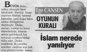 Ben böyle ideoloji ta'rîfi işitmemiş idim hiç. Muharrir efendi, ideolojilerin tanrısal ya da doğal yasaların yerine geçmek istediklerini söyleseydi, anlayabilir, kendisine hak verebilirdim belki. Lâkin, öyle demeyor. Acebâ, bir zamanlar, ba'zı Müslüman mütefekkirlerin de iltifât etdikleri bir paradoksun câzibesine mi kapıldı Ege Bey? Hani "dinsizlik dîni" filân derlerdi ya!