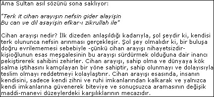 "Terk it cihan arayışın nefsin gider alayişin Bu can ve dil asayişin efkar-ı zikrullah ile"