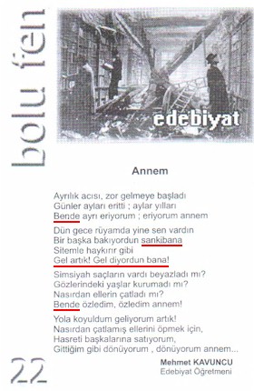 Lâkin ey azizler, bir sûretini görmekde olduğunuz şiir ile Bolu Fen'in yiğirmi ikinci sahîfesinde karşılaşınca hoşnudsuzlukdan öte bir his, âdetâ bir dehşet hissi sardı benim içimi. Hele altında "Mehmet KAVUNCU / Edebiyat Öğretmeni" ibâresini görünce tüylerim ürperdi.
