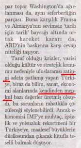 Birincisi zebân-ı İngilizden lisânımıza sızan yeni kelimelerden biri olan "rating"in imlâsına dâirdir. Siz de farkındasınızdır, bu nevzuhur kelime "reyting" deyû telâffuz olunmakda ve birçoklarınca "reyting" deyû yazılmakdadır. Analizci Bilici Abdülhamid Bey'in işbu kelimeyi "rating" şeklinde yazmış olması, Türk kaari'lerini şaşırdabilir, değil mi? Böylesi ecnebî kelimeleri, menşe'lerine uygun şekilde tahrîr etmek îcâb etdiğinde dırnak yahud parantez gibi bir işâret ile bu husûsa dikkat çekmek, kanâatim odur ki, böyle sanki Türk lâfzıymış gibi yazmakdan evlâdır.