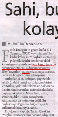 Bugünkü kesikimiz bir ilâveden. Radikal gazetesinin her Cum'a kaari'lerine vermekde olduğu Radikal Kitap nâm ilâvenin dâimî muharrirlerinden Murat Batmankaya'nın "Sahi, bu kadar kolay mı?" serlevhalı yazısından kesildi. 18 Temmuz 2003 târihli, 122 nümerolu nüshanın 16. Sahîfesinden.