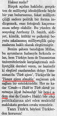 Evvelâ şu tırnak işâreti, yoksa "çift tırnak" mı demeli ey azizler? Bahsi edilen zâtın, ya'nî ki Herkül Millas'ın, Yunanistan'da "Türk ajanı" olmakla suçlanışını böylece tırnaklamış olan Eyüp Bey, aynı zâtın Türkiye'de "Yunan ajanı" olmakla suçlandığını yazabilmeli, açdığı tırnağı doğru yerde kapatabilmeli idi. Lâkin, ey azizler, görmekde olduğunuz gibi bunu doğruca yapamamış, tırnağın haddini aşırıvermiş ve şöyle yazmışdır: "Türk ajanı olmakla". Deyebilirsiniz ki ey azizler, bu "olmakla" kelimesi, evveline dahî râci'dir ve "Türk ajanı olmakla" makaamındadır. Bunun farkındayım, ey azizler ve buna rağmen bu kanaatdeyim. Tırnaklanacak ibârenin bir istiklâli olmalı, değil mi?