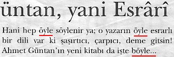 Ey azizler,Bugünkü kesikimiz 18 Temmuz 2003 târihli Akşam-lık'ın beşinci sahîfesinden kesilmiş olup Gültekin Emre nâm şâir ve muharririn Ahmet Güntan nâm şâir ve muharririn Esrârîler nâm kitabını medih sadedinde kaleme aldığı -kılavyeden geçirdiği mi deyecek idik, tüh!- yazının spotu olmakdadır.