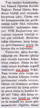 Bugünkü kesikimiz cerîde-i Zaman'ın 26 Eylül 2003 Cum'a günkü nüshasının on üçüncü sahîfesinde Bülent Korucu'nun kûşesinden kesilip tarandı. Makale-i Bülend'in serlevhası "Akıl, vahiy ve Gürüz" olup bu üç kelimenin bir araya gelmişliği başlı başına bir te'accüb mevzû'u olsa yeridir. Çün ki ey azizler, memleketin pek de kalabalık olmayan mütegalibe sınıfının mümtâz sîmâlarından olan YÖK reisi -ba'zıları kendisine "komiser" ve "kumandan" demeği tercîh ediyorlar- Kemal Gürüz ile "akl"ın ve hele "vahy"in birlikde zikrolunması "ihtiras", "adâvet", "nefret" gibi kelimelere karşı büyük bir haksızlıkdır. Bendeniz haksızlık gördüm mü huzursuz olurum ey azizler.