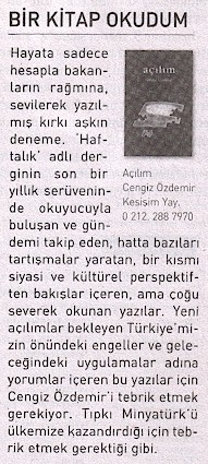 2. "Haftalık adlı derginin son bir yıllık serüveninde okuyucuyla buluşan ve gündemi takip eden, hatta bazıları tartışmalar yaratan, bir kısmı siyasi ve kültürel perspektiften bakışlar içeren, ama çoğu severek okunan yazılar."