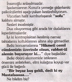 Pekeyi, nedür deyû sü'âl eder iseniz, ey azizler, şudur derim: "Hikmeti cemil cümlemizin üzerinde olsun, rabbet-ül alemin buyuruyor ki..." cinsinden hiçbir cehâletin, hiçbir garazkârlığın, hiçbir mizah anlayışının bağışlatamayacağı yâveleri etmekden utanmayan bir gerzek, mübârek Urfa toprağını sızım sızım sızlatan, mübeşşer İstanbul'un havasını kirleten bir garîbe-i hilkat olsa gerekdir.