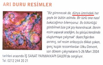 Ey azizler,Bugün sizlere arz eylediğim kesik, mecmû'a-i irfan beyninde kendine mahsus bir yeri doldurmakda olan Aylık Kültür Dergisi Kılavuz'un 12 nümerolu Mart 2004 nüshasının haberlere ayırılan sahîfelerinden birinden olan beşinci sahîfenin sol sütûnunun alt kısmından kesilip taranmışdır.Görmekde olduğunuz gibi bir sergi haberidir bu.