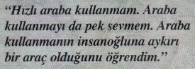Bilenler bilir, Ferzan Özpetek bir sinema recisörüdür ve İtalya'dan çıkmış bir Türkdür. Filimleri muhtelif festivallerde muhtelif ödüller almışdır. Haftalık'ın "Hayattan ne öğrendim?" faslında öğrendiklerini sıralamış ve kanâ'at-i 'âcizânem odur ki, hayli şâyân-ı dikkat sözler etmişdir. Lâkin, sûretini gördüğünüz kesikdeki cümleler ol sözler arasında bulunmamakdadır. Bulunmayabilir! Fotografi altına konan işbu üç cümleden üçüncüsü benim canımı sıkmışdır. Bu cümle ister Ferzan Özpetek'in ağzından çıkmış olsun, ister röportajı edenin şeyinden şey olsun, bu hâliyle kötü bir cümledir. Ne demek "Araba kullanmanın insanoğluna aykırı bir araç olduğunu öğrendim."? Araba araçtır, "araba kullanma" deyû bir "araç" olabilir mi? Olamaz. Sürç-i lisân olmalı, evet. 45 yaşında bir sinema yönetmeninin böyle düşünmesi, ya'nî ki otomobillere ve onları kullanmaya böyle "soğuk" nazarla bakması hoşuma gitmişdir ey azizler.