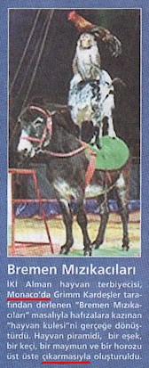 Birinci cümle: "İki Alman hayvan terbiyecisi, Monaco'da Grimm Kardeşler tarafından derlenen "Bremen Mızıkacıları" masalıyla hafızalara kazınan "hayvan kulesi"ni gerçeğe dönüştürdü."