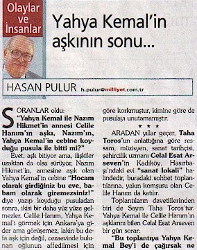 Nedeni şu: Hasan Pulur, Yahya Kemal ile Celîle Hanım'ın münâsebetlerini anlatır iken, "Evet, aşk bitiyor ama, ilişkiler uzaktan da olsa sürüyor." demiş ve bu "ilişkiler"i anlatmış bir bir. Lâkin bunlar öyle ilişkiler ki, serâpâ aşk alâmetlerinden ibâret. Ya'nî, aslında "aşk" bitmemiş, belki rûberû münâsebetler bitmiş.