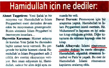 Geçen aylarda İslâm'ın mu'âsır ulemâsından Muhammed Hamîdullah Beyefendi'yi rahmet-i Rahmân'a uğurladık. Onun âsâr-ı meşhûresi beyninde İslâm Peygamberi'nin müstesnâ ve mümtâz bir mevkıinin bulunduğu ma'lûmunuzdur. Şimdi, cerîde-i Yeni Şafak, ol eseri kupon mukaabilinde kaari'lerine hediye eylemeğe karar vermiş. İyi etmiş. Bu cins ameliyelere "puromosyon" mu ne deyorlar. Desinler. Ol cerîde bu hayırlı teşebbüsünü i'lân ve celb-i alâkayı tezyîd içün birtakım zevâtın fikirlerini sormuş. Sorar ya...